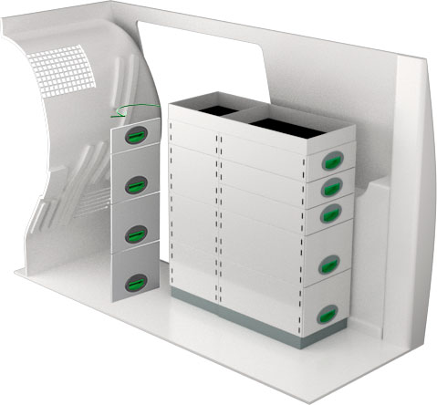 Stommarna kan i sitt enklaste utförande kombineras med fasta hyllplan med säkerhetskant som ger mycket fria ytor. En panelplåt på stommens utsida ger plats för behovsstyrda tillbehör som exempelvis olika hållare, klädhängare eller varför inte en pappershållare. Dessa är enkla att komplettera med i efterhand när nya behov uppstår. Modulerna går också att variera med utdragbara kassetter eller dropfronter som ger förenklad åtkomst. Kombinera med lådavdelare och plastbackar som bibehåller ordningen för artiklar av den mindre storleken.