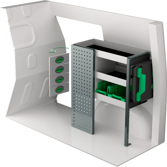 Stommarna kan i sitt enklaste utförande kombineras med fasta hyllplan med säkerhetskant som ger mycket fria ytor. En panelplåt på stommens utsida ger plats för behovsstyrda tillbehör som exempelvis olika hållare, klädhängare eller varför inte en pappershållare. Dessa är enkla att komplettera med i efterhand när nya behov uppstår. Modulerna går också att variera med utdragbara kassetter eller dropfronter som ger förenklad åtkomst. Kombinera med lådavdelare och plastbackar som bibehåller ordningen för artiklar av den mindre storleken.