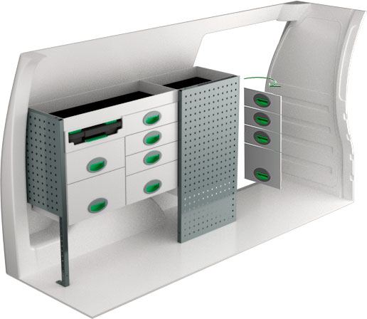 Stommarna kan i sitt enklaste utförande kombineras med fasta hyllplan med säkerhetskant som ger mycket fria ytor. En panelplåt på stommens utsida ger plats för behovsstyrda tillbehör som exempelvis olika hållare, klädhängare eller varför inte en pappershållare. Dessa är enkla att komplettera med i efterhand när nya behov uppstår. Modulerna går också att variera med utdragbara kassetter eller dropfronter som ger förenklad åtkomst. Kombinera med lådavdelare och plastbackar som bibehåller ordningen för artiklar av den mindre storleken.