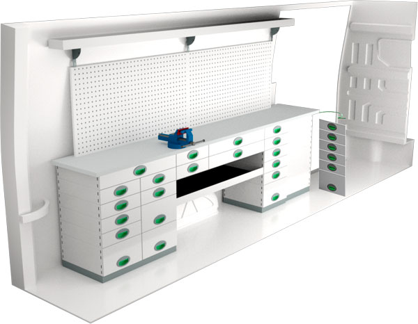 Stommarna kan i sitt enklaste utförande kombineras med fasta hyllplan med säkerhetskant som ger mycket fria ytor. En panelplåt på stommens utsida ger plats för behovsstyrda tillbehör som exempelvis olika hållare, klädhängare eller varför inte en pappershållare. Dessa är enkla att komplettera med i efterhand när nya behov uppstår. Modulerna går också att variera med utdragbara kassetter eller dropfronter som ger förenklad åtkomst. Kombinera med lådavdelare och plastbackar som bibehåller ordningen för artiklar av den mindre storleken.