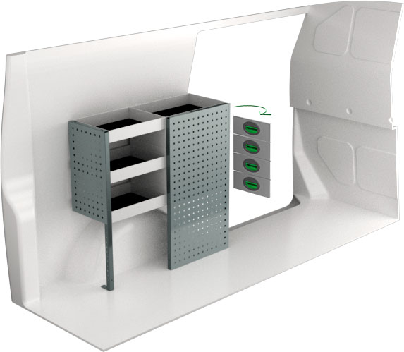 Stommarna kan i sitt enklaste utförande kombineras med fasta hyllplan med säkerhetskant som ger mycket fria ytor. En panelplåt på stommens utsida ger plats för behovsstyrda tillbehör som exempelvis olika hållare, klädhängare eller varför inte en pappershållare. Dessa är enkla att komplettera med i efterhand när nya behov uppstår. Modulerna går också att variera med utdragbara kassetter eller dropfronter som ger förenklad åtkomst. Kombinera med lådavdelare och plastbackar som bibehåller ordningen för artiklar av den mindre storleken.
